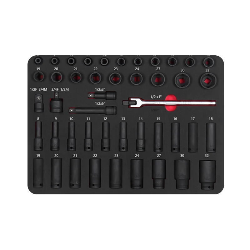 20PC 1/2″DR Impact Socket:8,9,10,11,12,13,14,15,16,17,18,19,20,21,22,23,24,27,30,32 20PC 1/2″DR Impact Deep Socket:8,9,10,11,12,13,14,15,16,17,18,19,20,21,22,23,24,27,30,32 2PC Extension Bar:1/2×3″,1/2×5″ 1PC 1/2″F Handle 2PC 1/2″Fx3/4″M,3/4″Fx1/2″M
