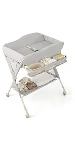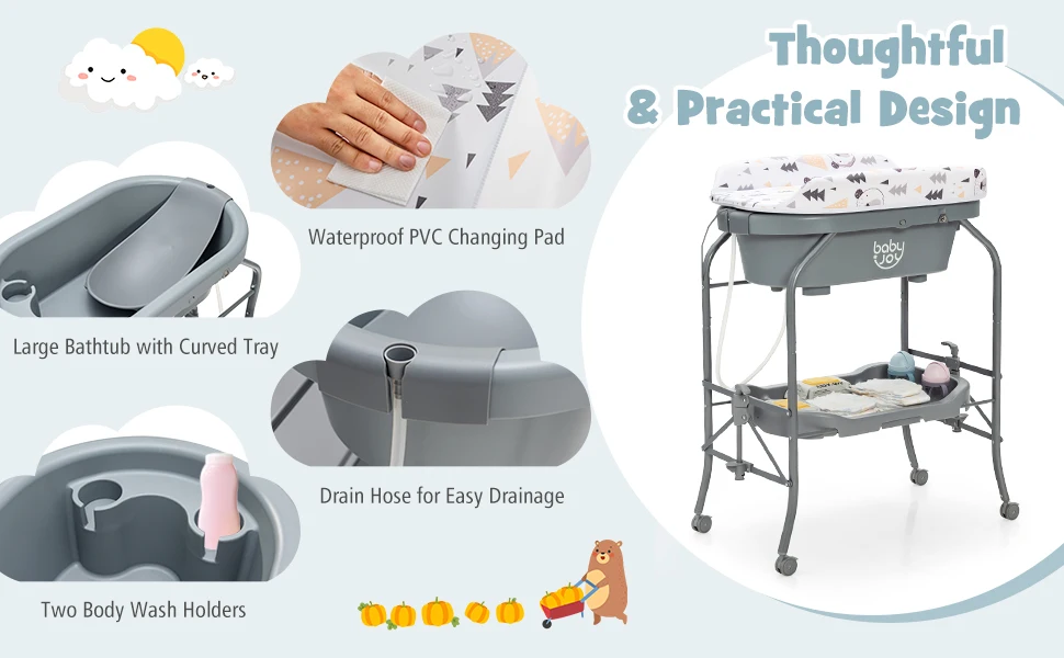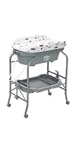 | More Features | Adjustable Height,Water Basin | Storage Rack,Safety Belt,Fence | Wheels,Foldable,Storage Slots | Adjustable Height,Trash Can | Drawers,Safety Rails & Strap |