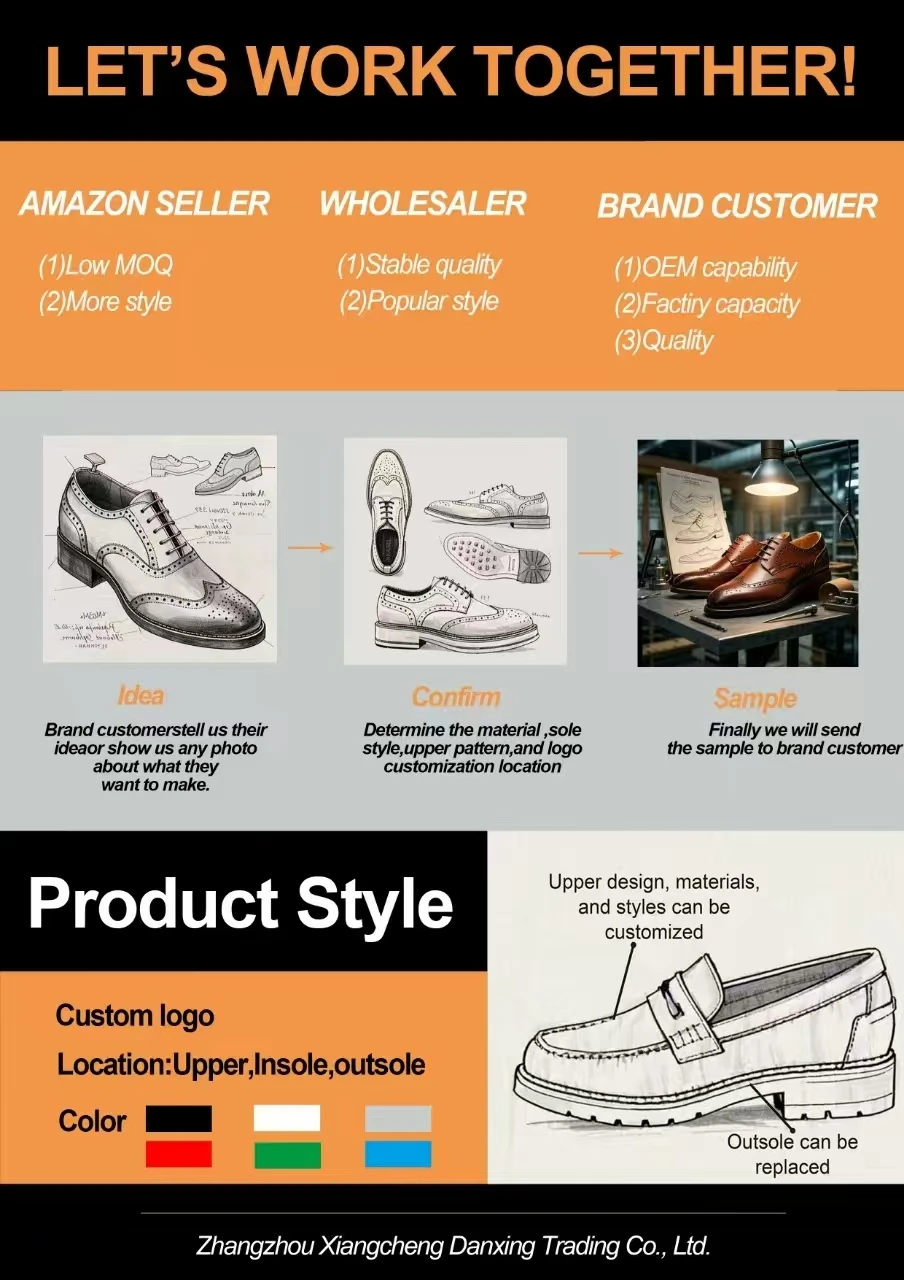 Danxing Footwear is a professional shoes company that provides all kinds of quality and fancy shoes. We offer wholesale. retail service. In Danxing, you will find, small MOQ of ODM/ODM is not a problem, as Danxing is aiming at best service for customers.