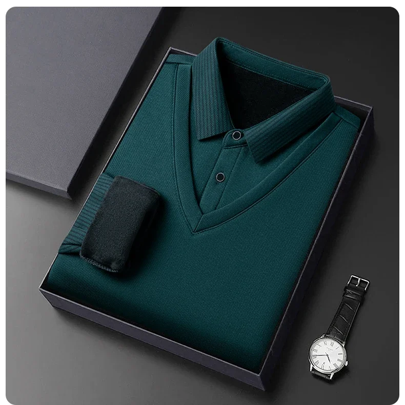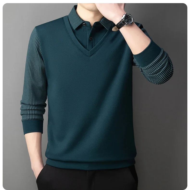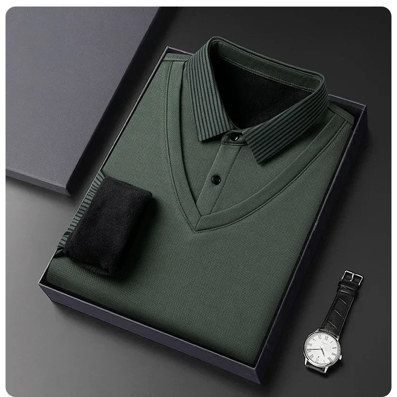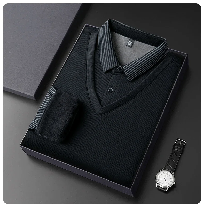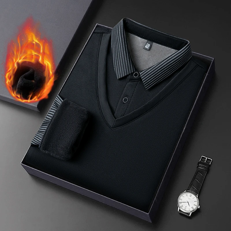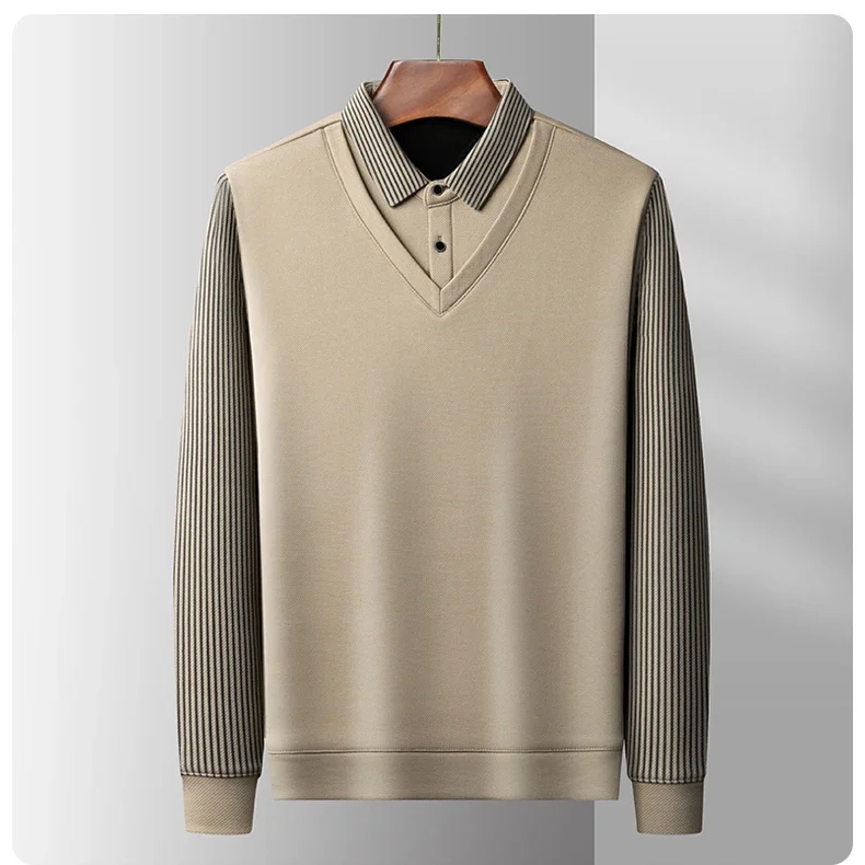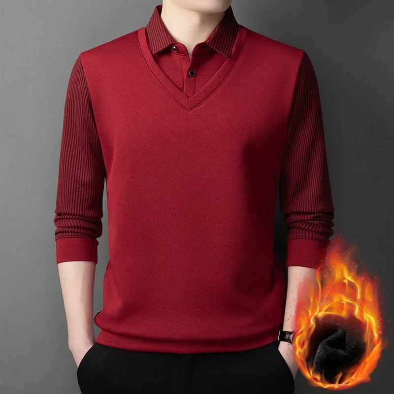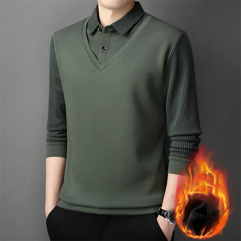 Long Sleeve T-shirt Shirts Winter Fleece Male Lapel Fake Two-piece Striped Regular Fit Thick Plush Warm Knitted Pullover Men Top