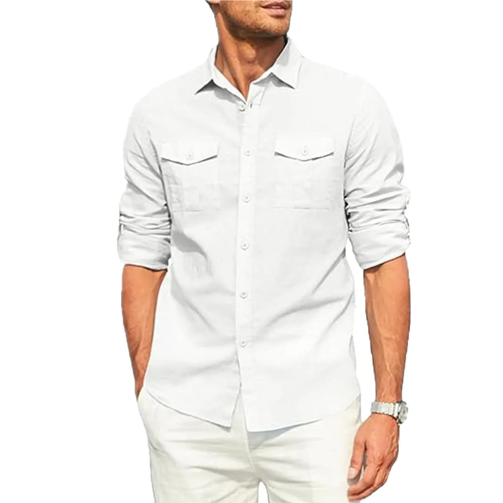 Men’s Shirt Double Pocket Cotton Linen Long Sleeve Shirt Casual Holiday Shirt Simple Lapel Solid Cargo Shirts Tops Blouses