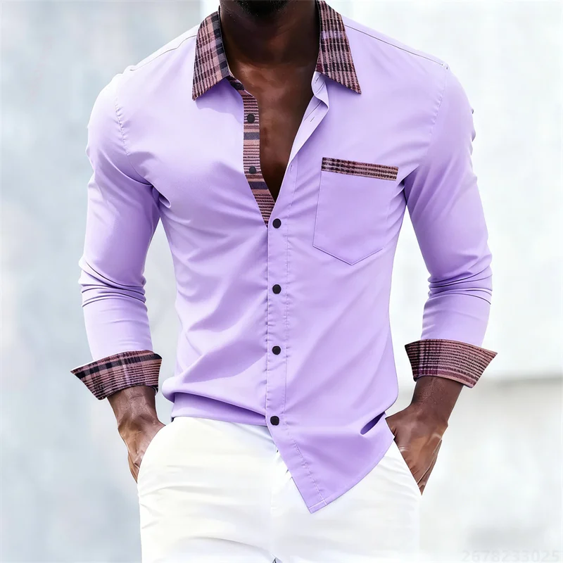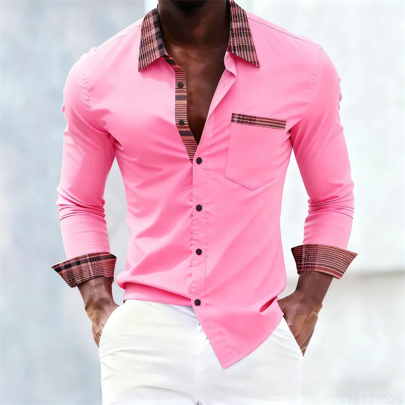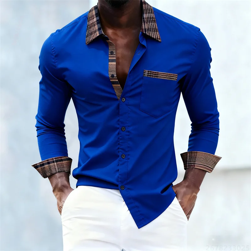 Men’s shirt with plaid collar, trendy printed shirt, stylish and casual slim-fit long-sleeved shirt, suitable for everyday wear.