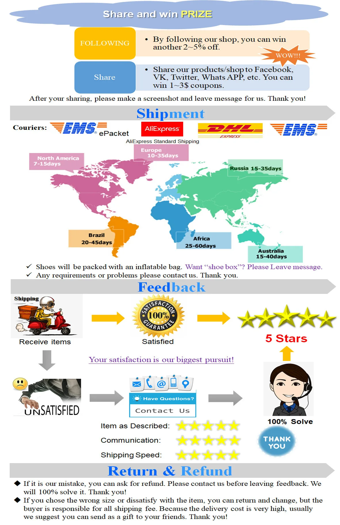 1️⃣ – The size of Chinese shoes is generally smaller than shoes in other countries such as Europe, Brazil, Mexico, and Russia etc., So please select the correct size according to our size instructions in stead of your shopping habit.