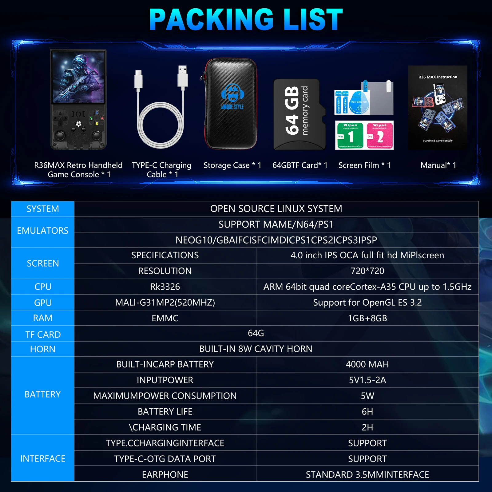 6) RK3326 Chip: With the professional RK3326 chip, it runs 2D & some 3D games seamlessly, delivering top-grade performance.