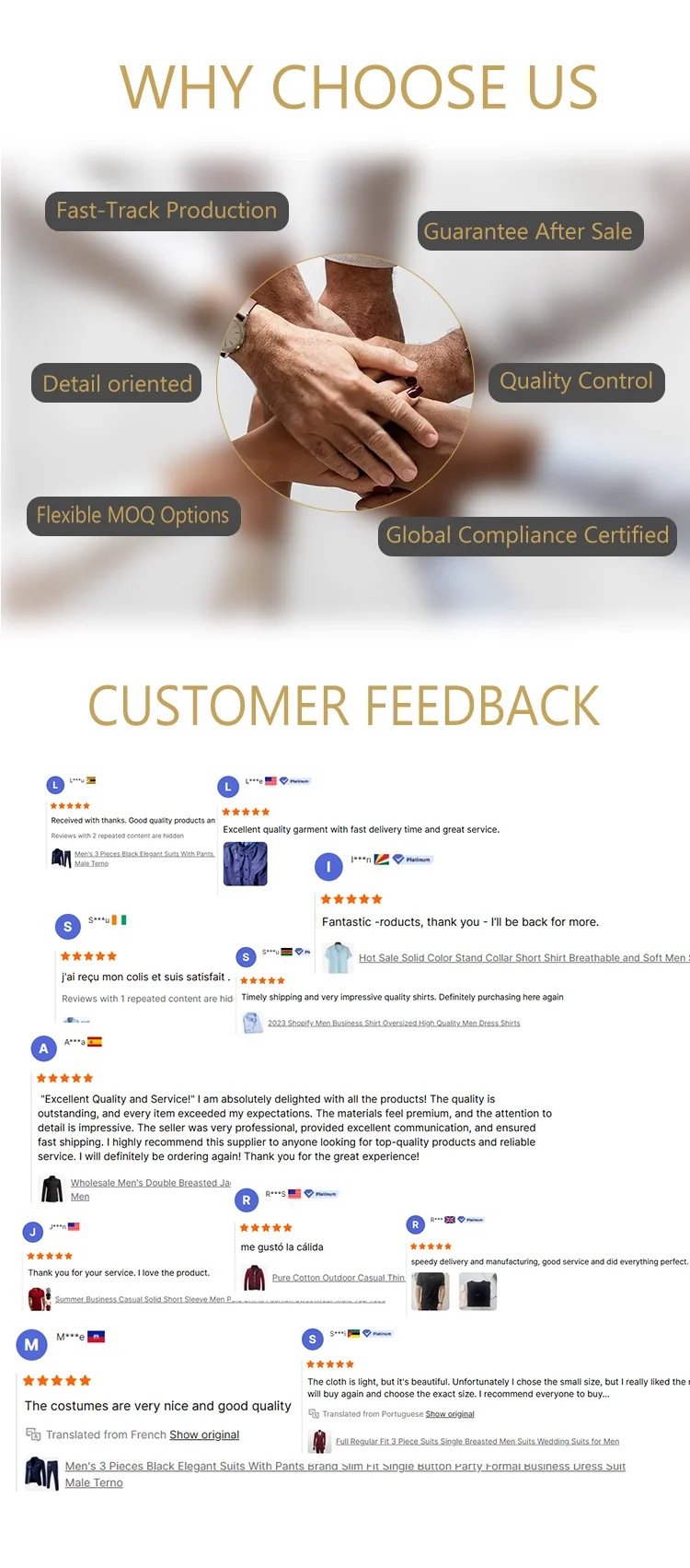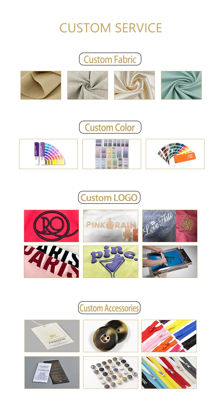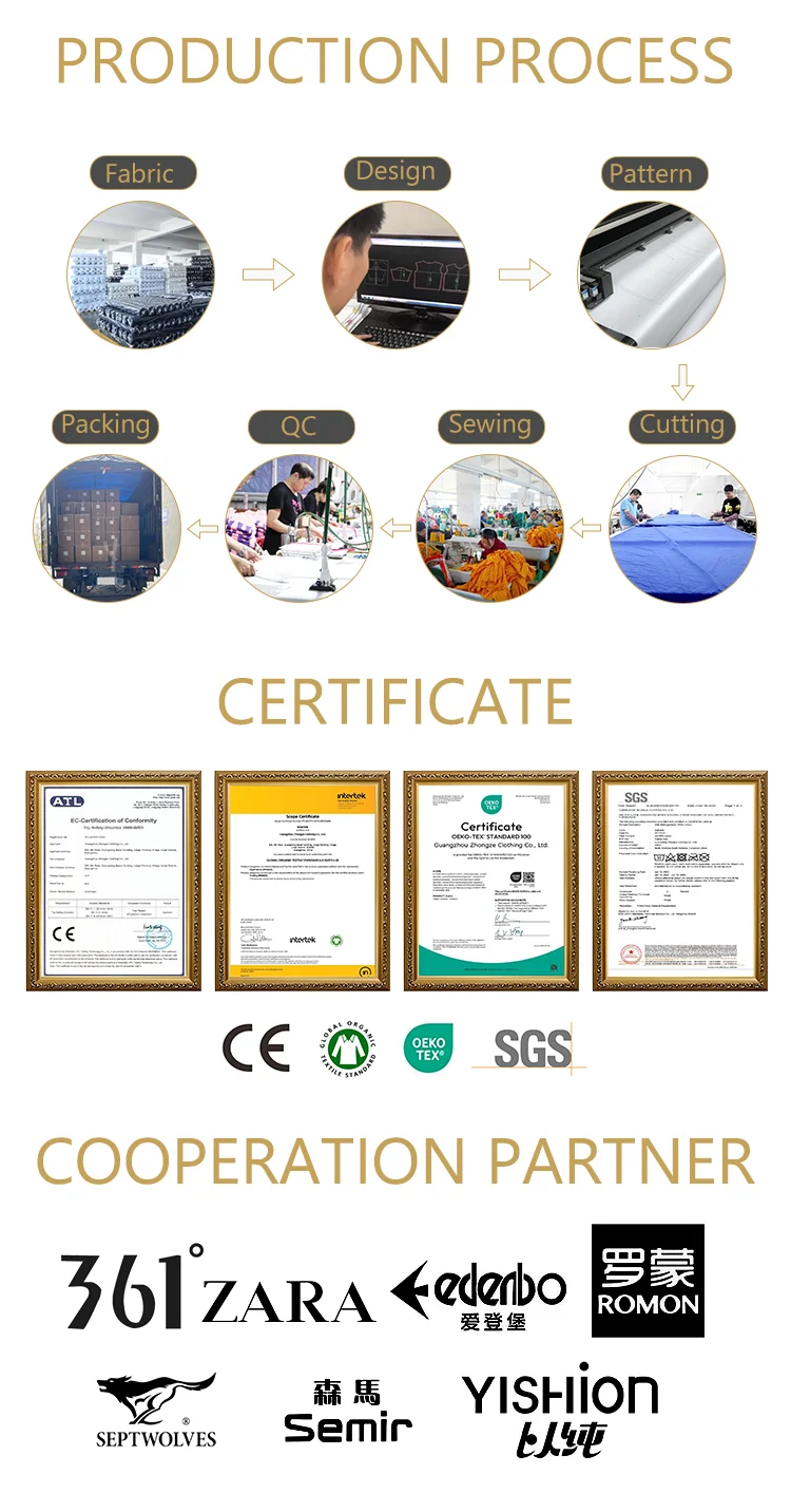 (2) Every garment can be made accurate by your demands, changes and your design. (3) Accept customer’s size and plus size. (4) You also could provide the pictures you like then we will manufacture them perfectly. (5) Keep smooth delivery on time. |