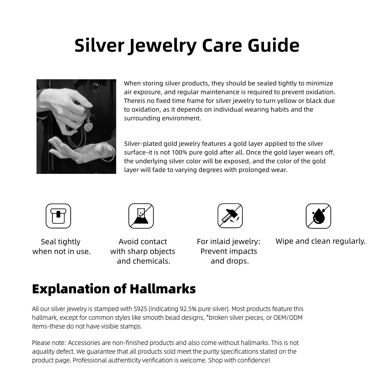 Natural materials have inherent flaws: black spots, cotton-like textures, ice cracks, uneven color; spots/pits/impurities from hand polishing; slight edge roughness. 3. Imperfection Definition These are normal for natural materials, not quality issues—no returns/exchanges for these. 4. Purchase Note Flaws are natural beauty; perfection-seekers buy cautiously. Core: Natural jewelry ≠ perfect; perfect jewelry ≠ natural. |