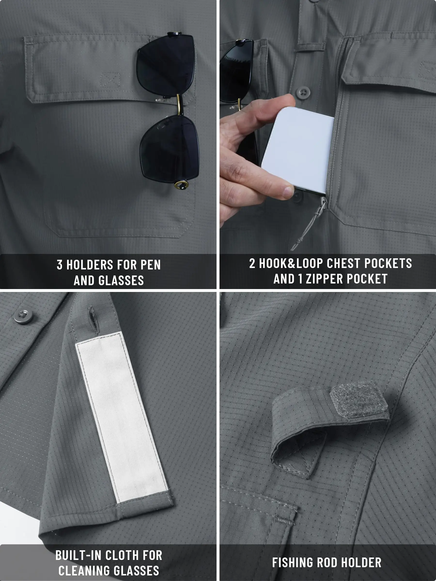 【 Multiple Utility Pockets 】Keep your essentials within reach with a chest zipper pocket, fish rod holder, pen slot, sunglasses holder, and glasses cloth.